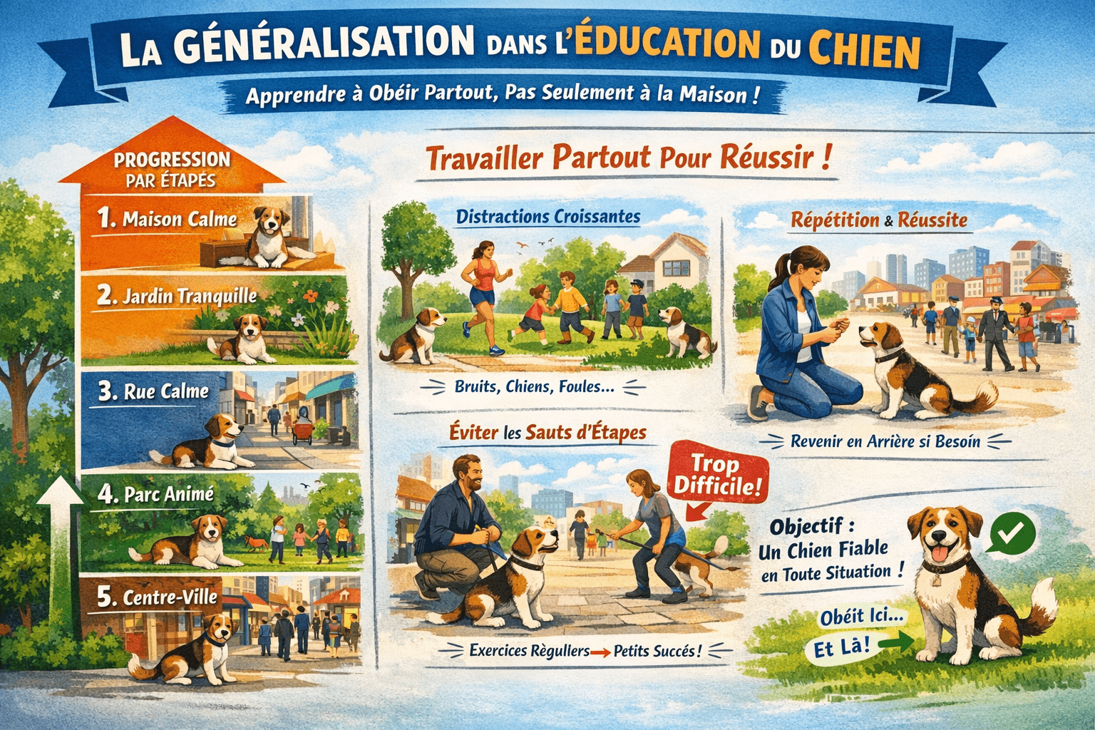 Un chien n’apprend pas comme un humain : il ne généralise pas naturellement un comportement d’un contexte à un autre. Cela signifie que s’il sait s’asseoir dans le salon, il ne comprendra pas automatiquement qu’il doit faire la même chose dans la rue, au parc ou devant d’autres chiens.