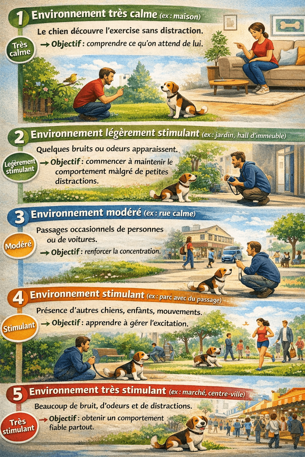 Pour aider le chien à réussir, il est essentiel de travailler dans plusieurs environnements, du plus simple au plus stimulant.